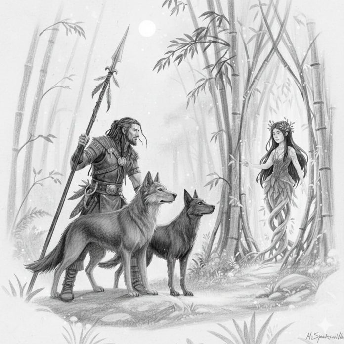 Blawa akhirnya bisa mengejar kedua anjingnya. Di situ, dia hanya menemukan sebuah pohon bambu yang tumbuh sendiri. Ukurannya sangat besar dan menjulang tinggi ke langit. Tidak ada hewan yang bisa diburu. Dia heran melihat tingkah kedua anjingnya yang sejak tadi menggonggong mengelilingi pohon bambu itu. Meskipun sempat putus asa, tetapi Blawa tetap berusaha memahami ulah kedua anjingnya itu. Dia masih terus berharap bisa mendapatkan hasil buruan di hari itu. Karena merasa lelah, Blawa memutuskan untuk beristirahat di situ.